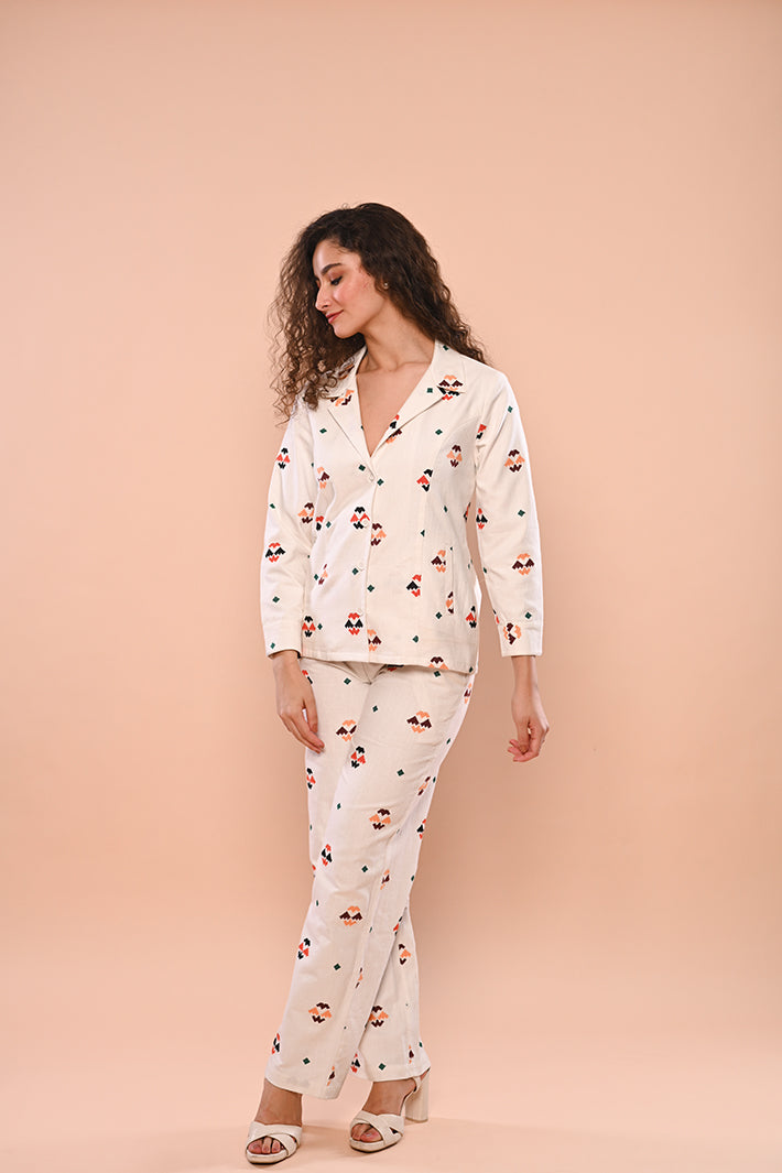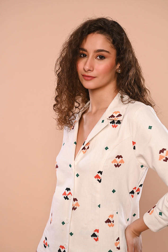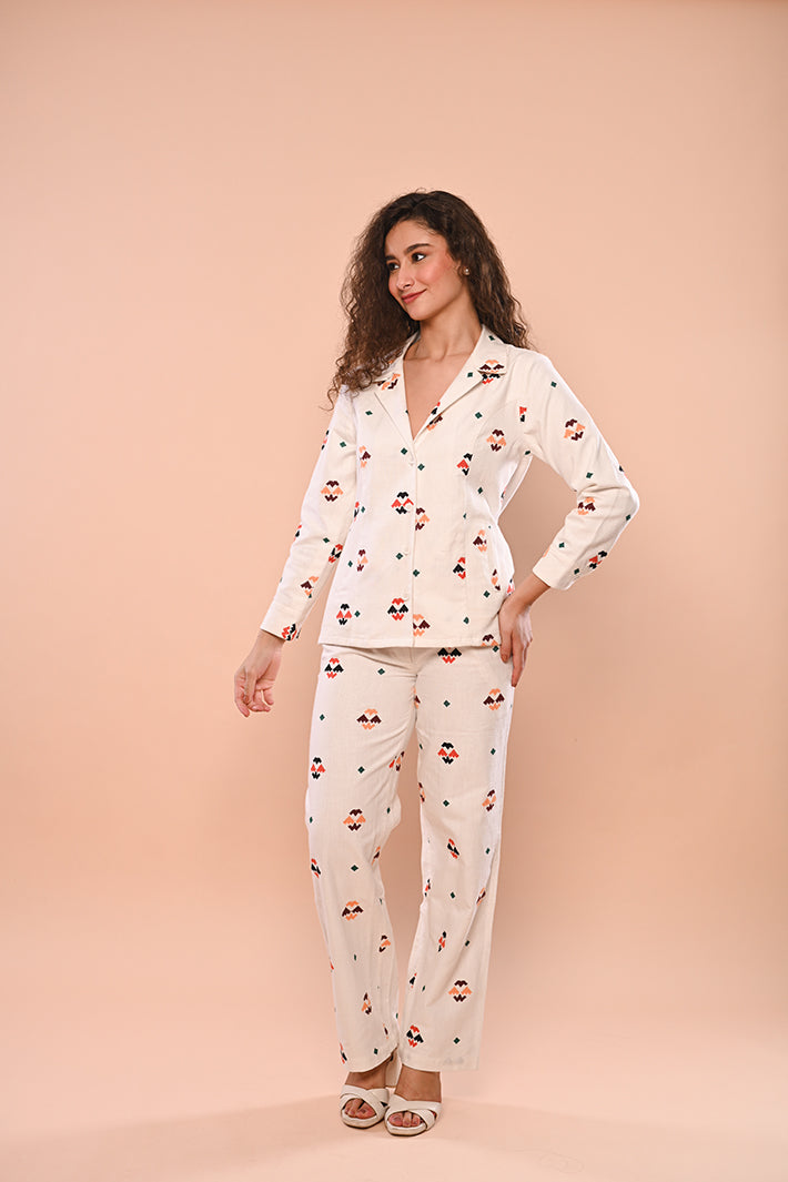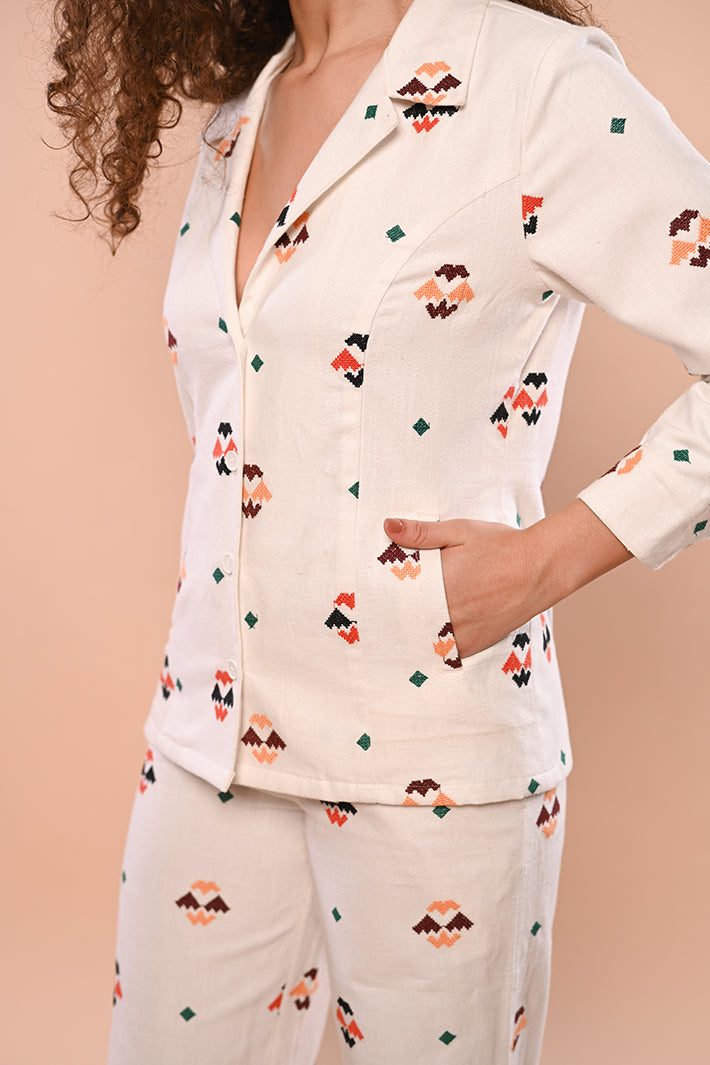 Make a statement with our Aztec-Inspired Embroidered Co-ord Set that comes with a Long Full sleeves Jacket and Pants. This set embraces a blend of cultural elegance and contemporary fashion.