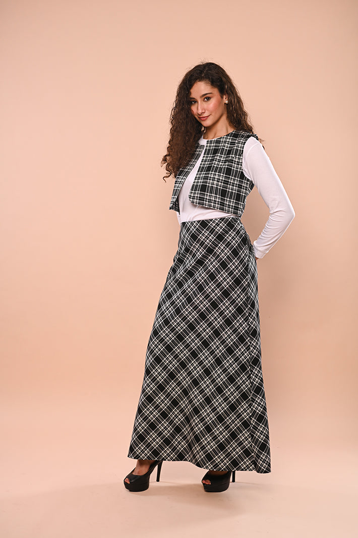 Classic checks meet modern tailoring — our Black & White Check Flannel Set brings timeless style to the contemporary wardrobe. Crafted from soft flannel fabric, this coordinated ensemble features a cropped waistcoat and a sleek long skirt, designed for both comfort and sophistication. The monochrome plaid pattern adds structure and visual harmony, while the clean silhouette makes it versatile for daywear or elevated casual outings. Pair it with a crisp shirt or a fitted top to complete the effortlessly elegant look.