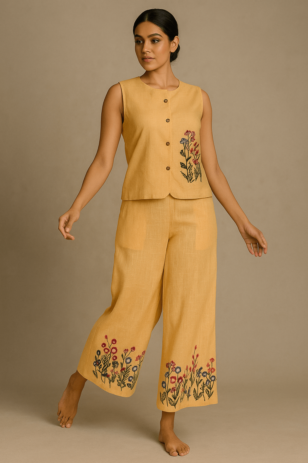 Brighten up your everyday dressing with our Orange Rustic Set, a perfect blend of earthy charm and artisanal detail. This two-piece ensemble features a sleeveless front-buttoned jacket paired with breezy, wide-legged pants — both made from soft, breathable cotton fabric for all-day comfort.