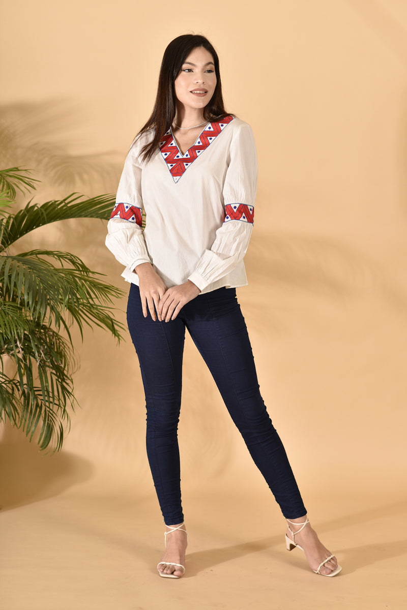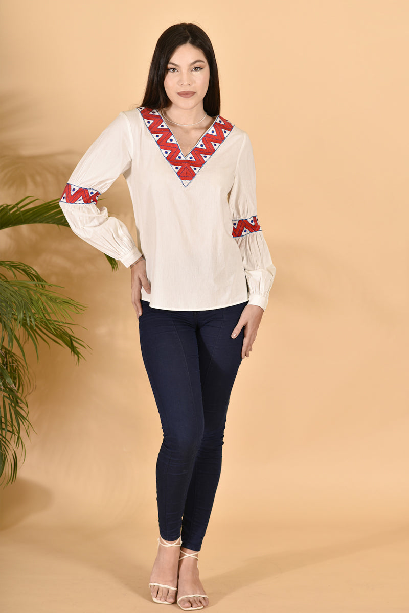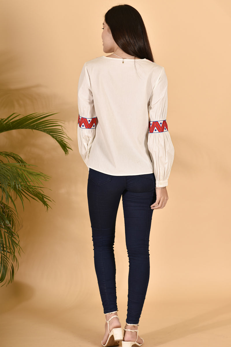 A fun silhouette with embroidery and puffed sleeves, this top is crafted in 100% cotton fabric.It makes for a great work outfit or going out. Buy this piece today to experience a near-perfect top that can be worn anywhere and everywhere!