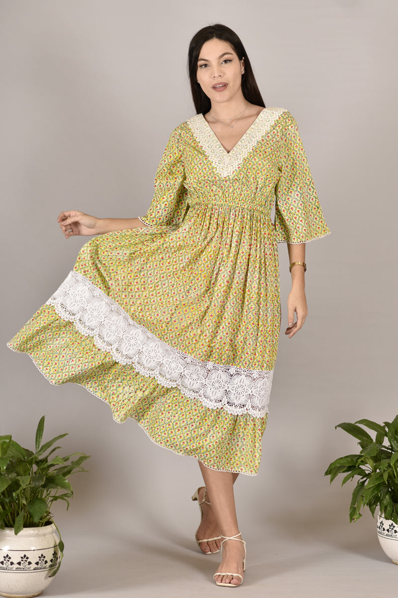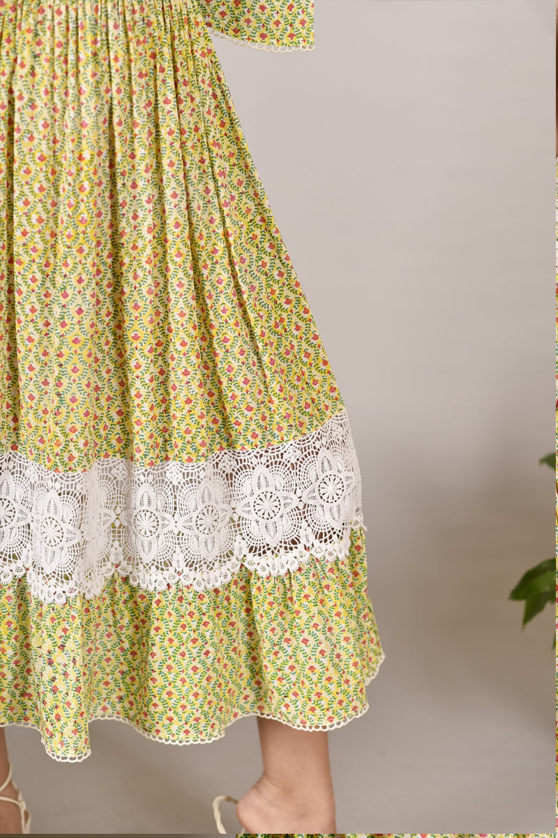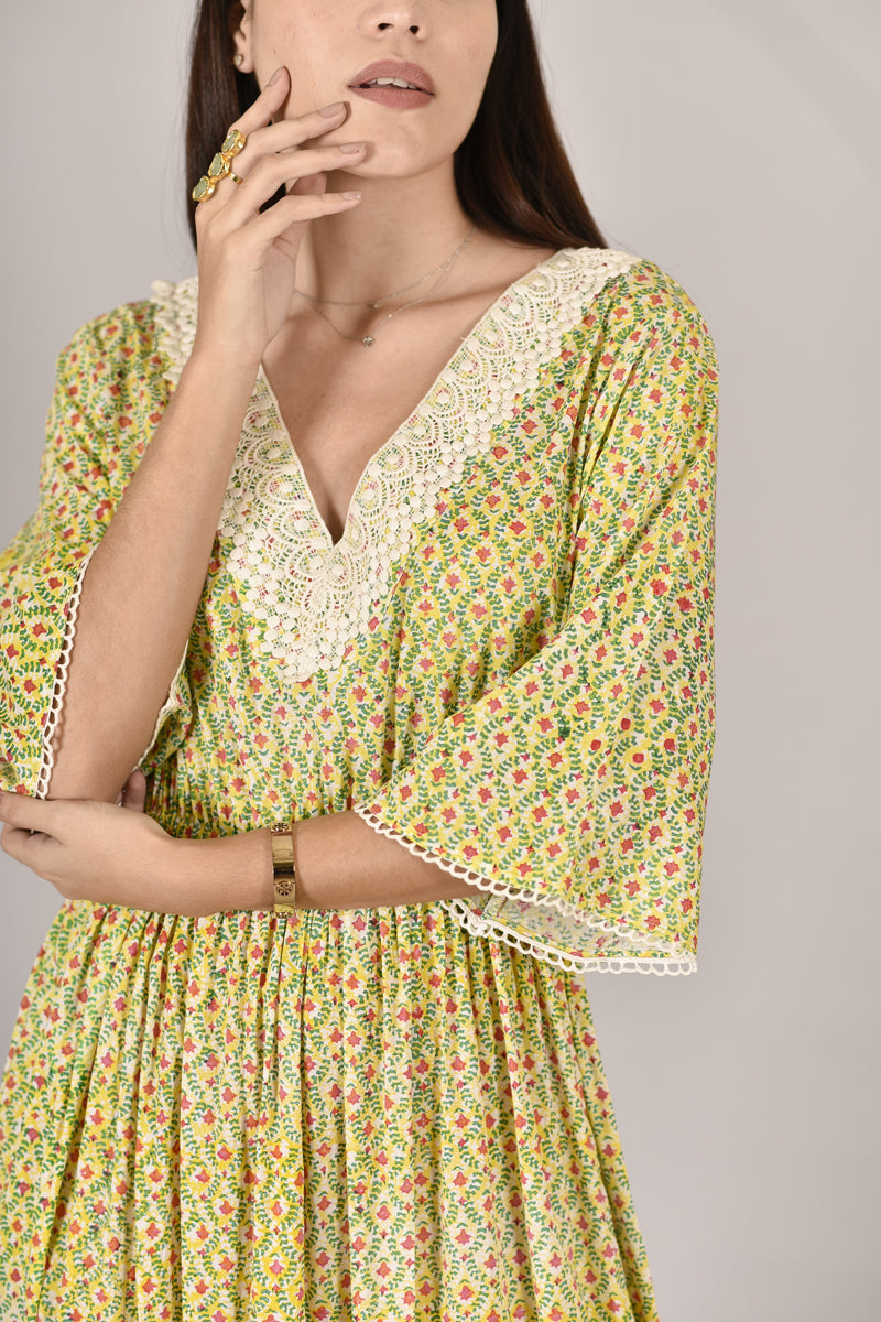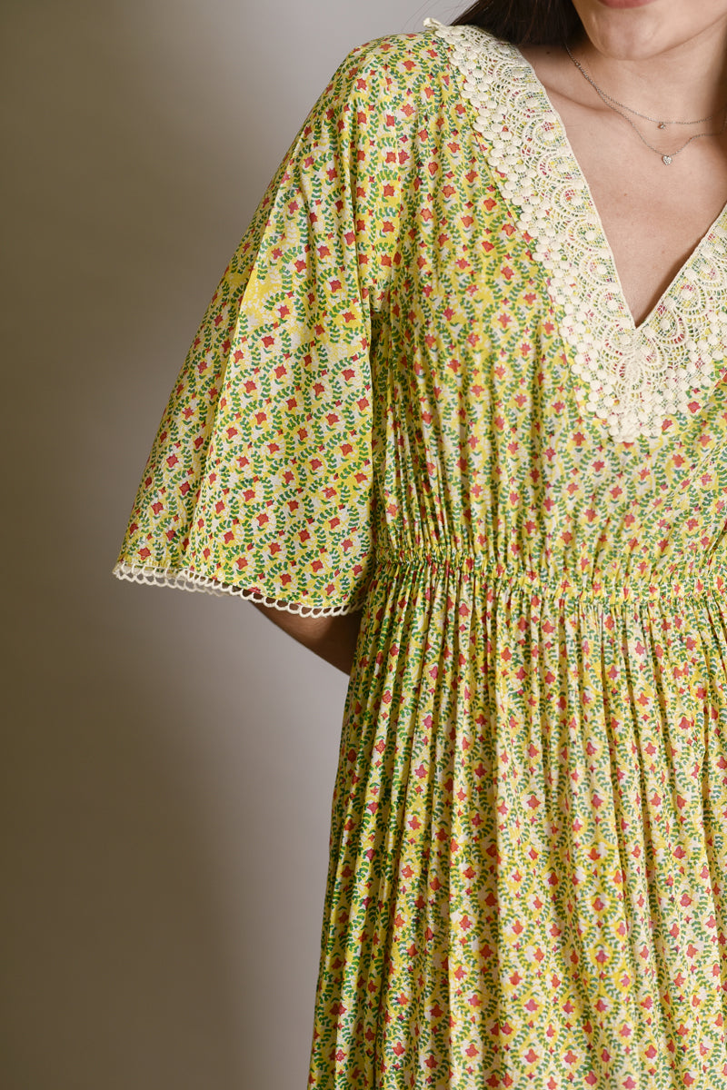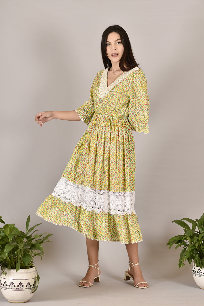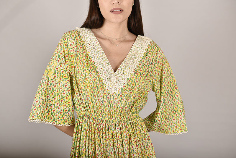 The breeziest cotton summer dress in yellow is here! It is crafted in lightweight breathable cotton fabric and block printed mindfully. It features elbow-length sleeves and an upcycled lace on the neck and at the bottom. Wear it for sundowners or to the beach.