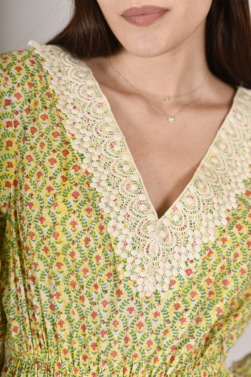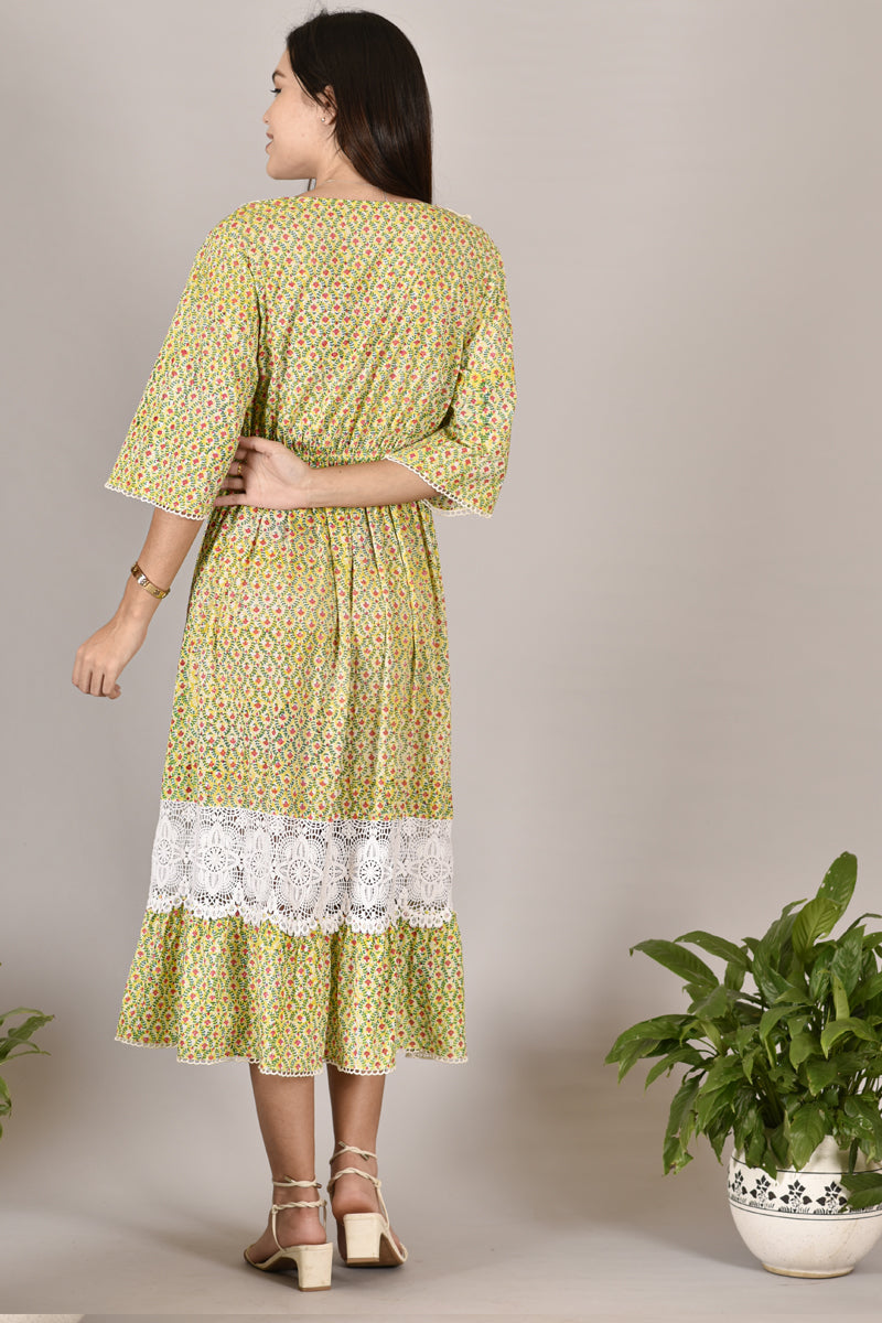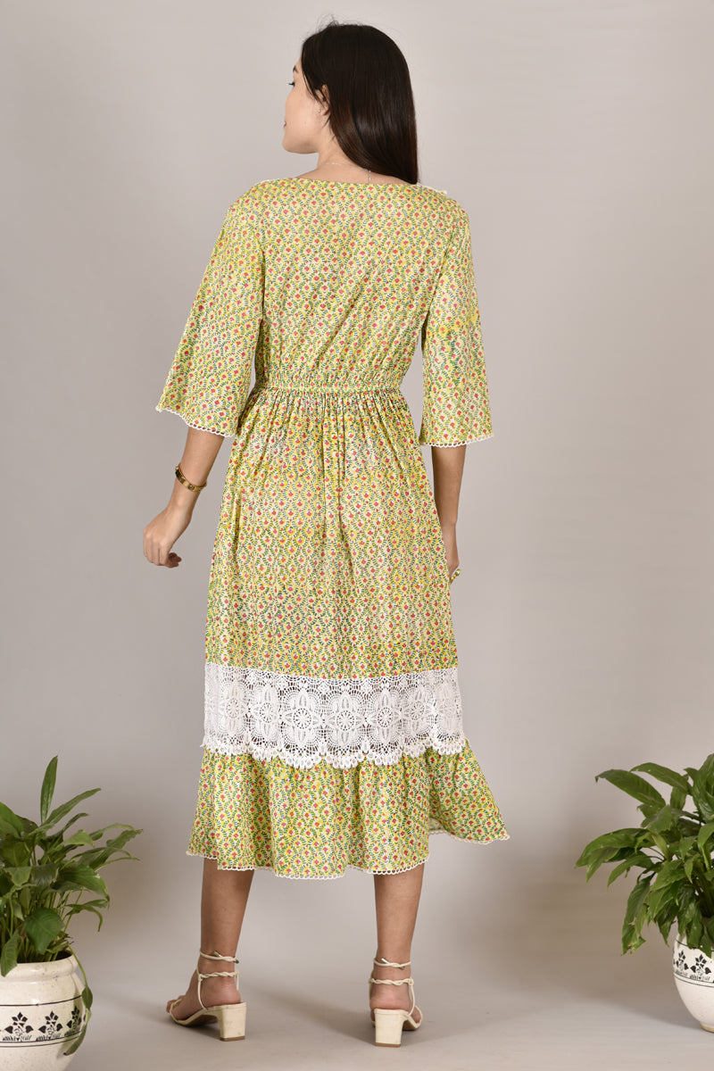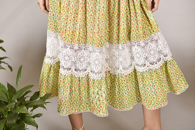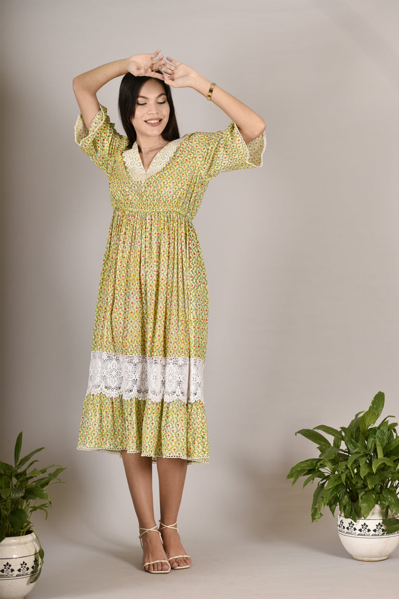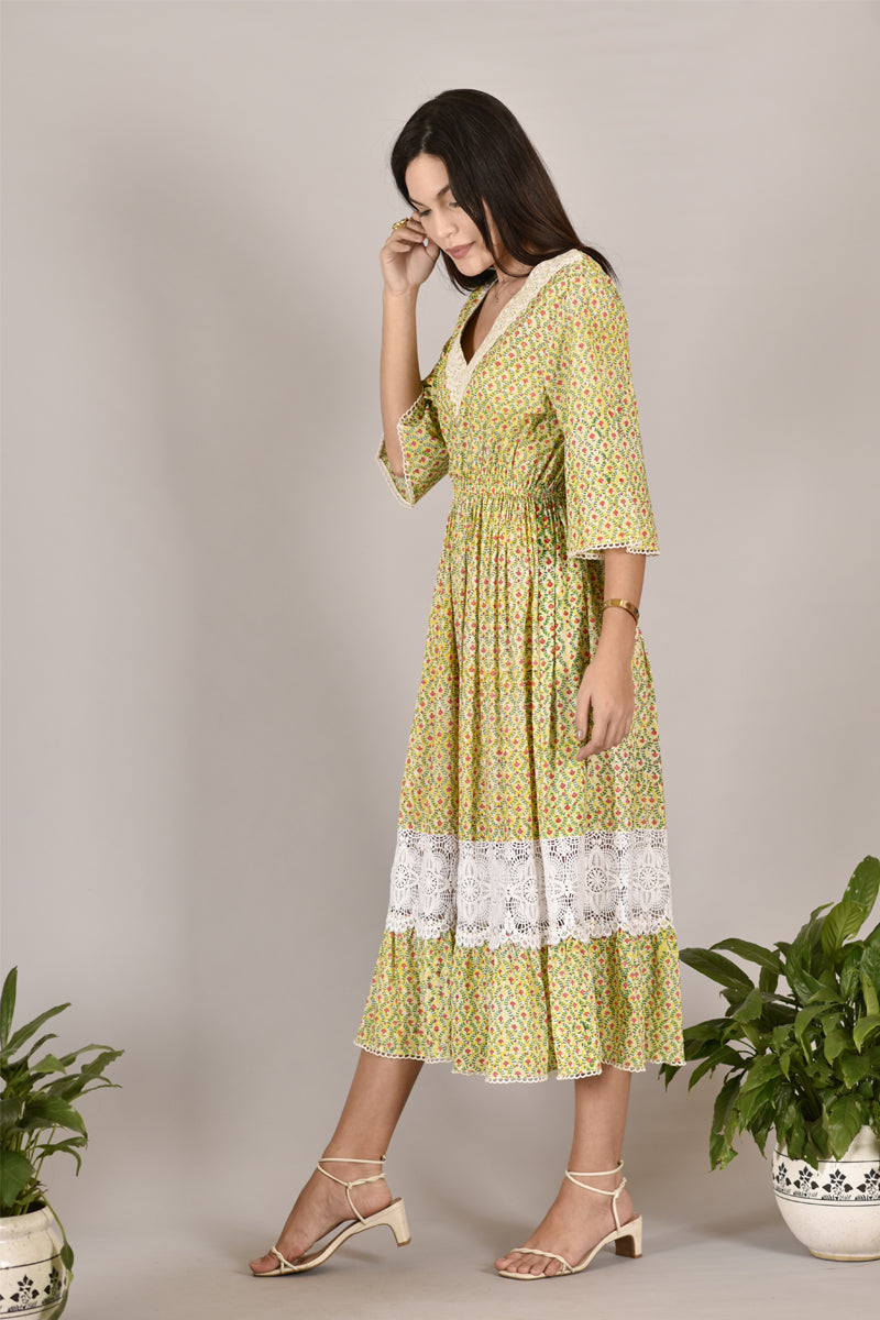 The breeziest cotton summer dress in yellow is here! It is crafted in lightweight breathable cotton fabric and block printed mindfully. It features elbow-length sleeves and an upcycled lace on the neck and at the bottom. Wear it for sundowners or to the beach.