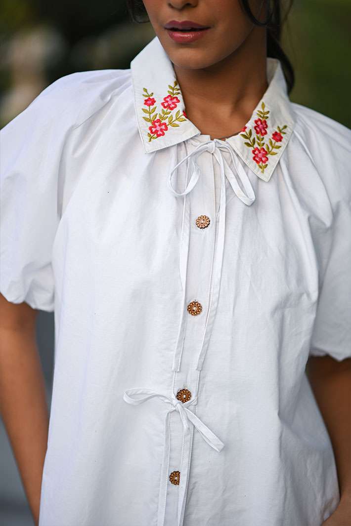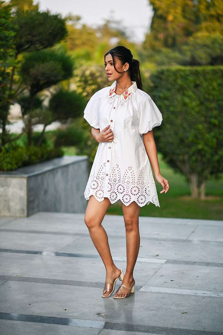 This stunning dress is all you need to make a statement. Minimalist in design and made from organic cotton with puff sleeves and little embroidery details on the collar, this piece is all about style and comfort. This outfit is the perfect choice whether it’s a casual outing or a nice vacation.