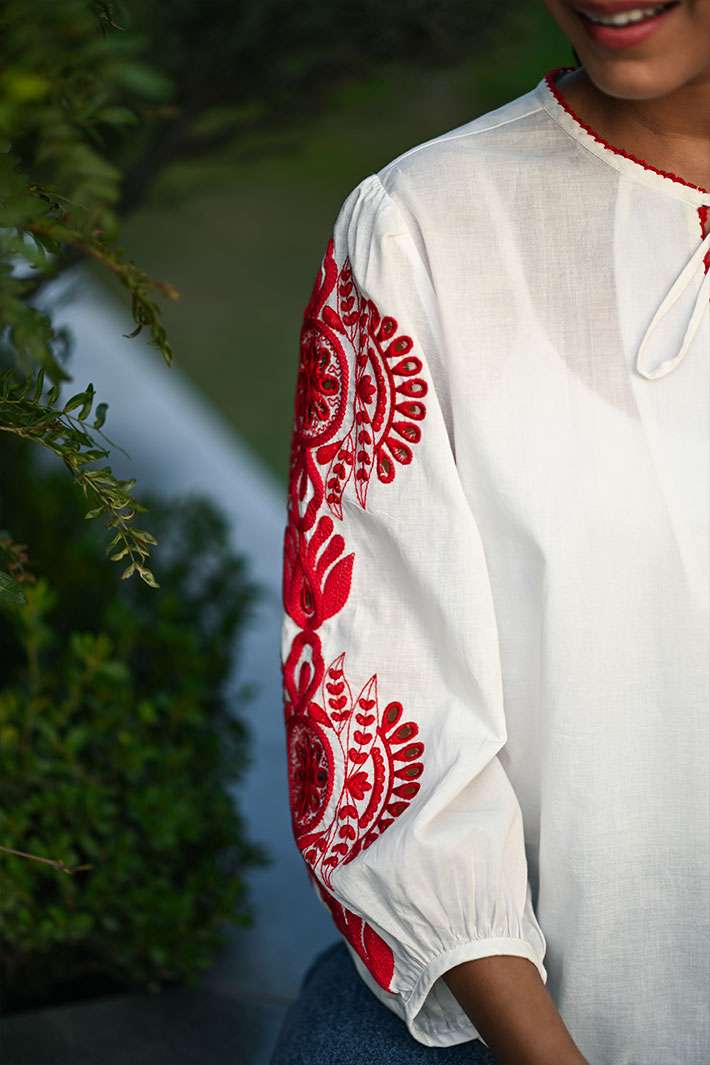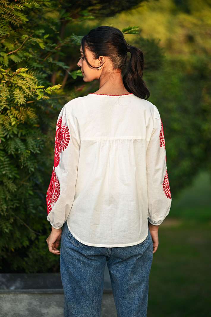From holidays to casual outings, the White & Red Top with Mandala Embroidery is surely the go-to outfit for any occasion. The beautiful sleeve pattern in red gives it a chic look. Made from organic cotton, this piece is breezy, comfortable and truly stunning.