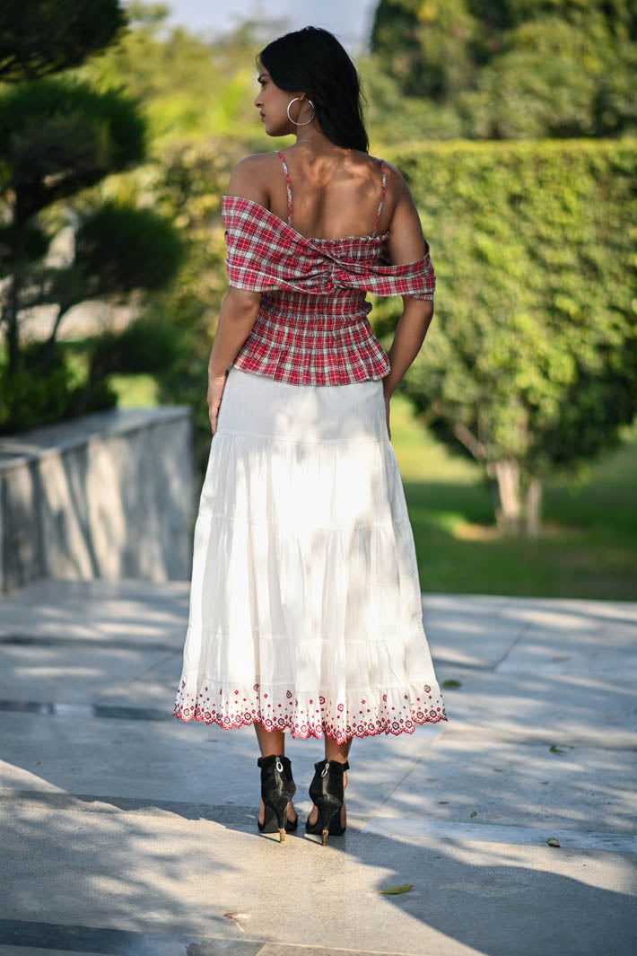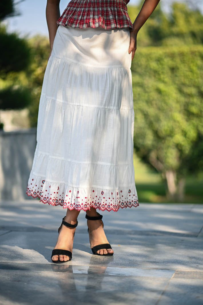 You can never go wrong with skirts when it comes to summer outfits. And if you need a skirt that is perfect for casual outings, lunches or a nice relaxing vacation, the White Skirt with Red Embroidery is what you are looking for. The subtle patterns in red on the lower border make this piece truly elegant.